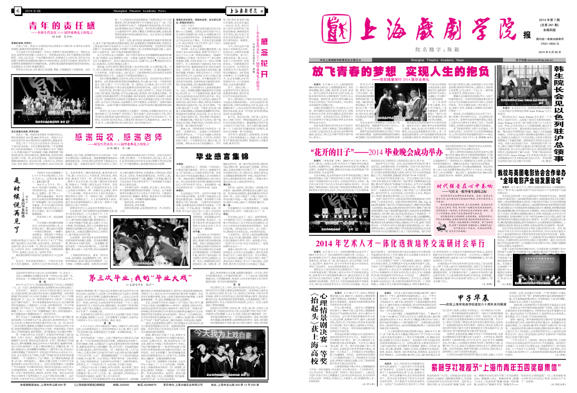 《上海戏剧学院报》2014年第7期(总第261期)已于2014年6月26日出版,本期共四版。重点内容有:《放飞青春的梦想 实现人生的抱负——我校隆重举行2014届毕业典礼》、《“花开的日子”——2014毕业晚会成功举办》、《韩生院长会见以色列驻沪总领事》、《我校与美国电影协会合作举办“全球电影产业链发展论坛”》等。本期第三版为“纪念莎士比亚、曹禺”专版,第四版为“毕业季”专版。敬请关注,也可点击下载阅读。(文、图、编辑:榕树)
