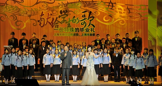 6月27日,“献给学生的歌·一份特殊的毕业礼”主题歌会在上海交通大学徐汇校区文治堂隆重举行。作为今年全市庆祝第30个教师节的系列活动,主题歌会邀请了上海各高校的党政领导,为即将走出校园的毕业生们献歌寄语。我校党委书记楼巍上台演唱一首《只要你过得比我好》,副院长郭宇应邀主持了整台晚会。此外,我校还派出专业团队,承担了歌会的舞美、灯光、化妆等重要工作。在整场晚会中,上戏学子拉拉队摇旗呐喊,不断与舞台节目呼应,成为本场晚会的一道亮丽风景。