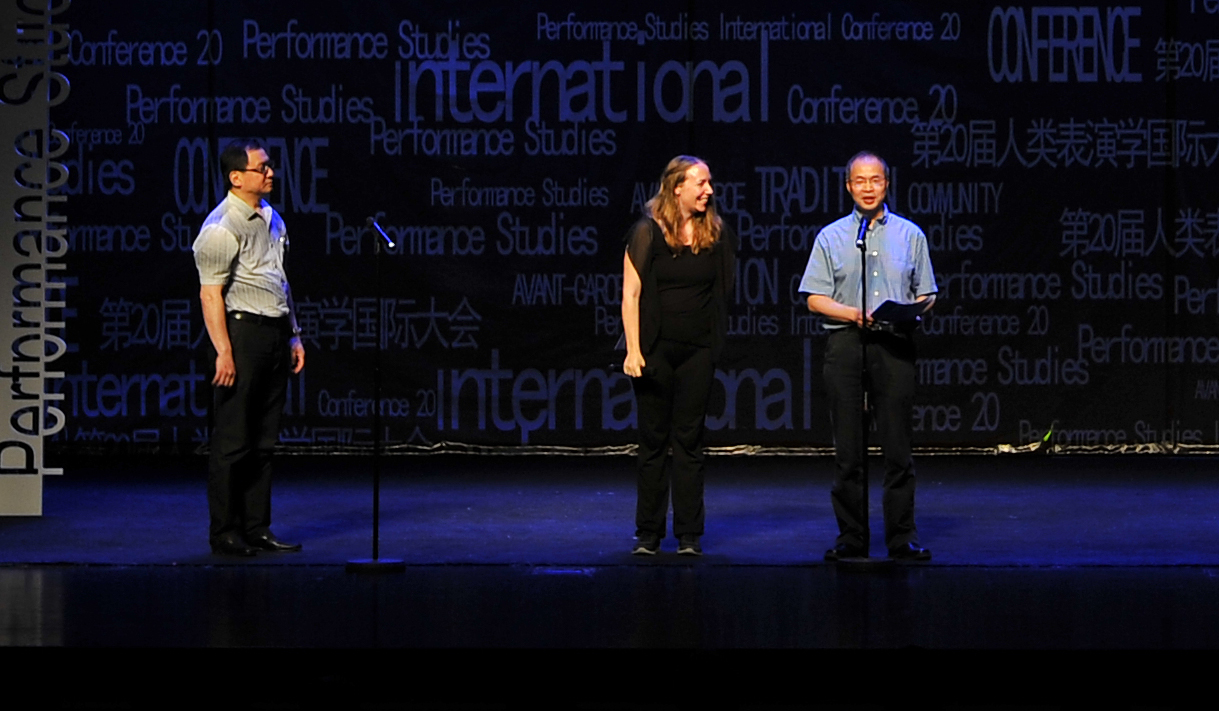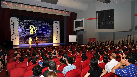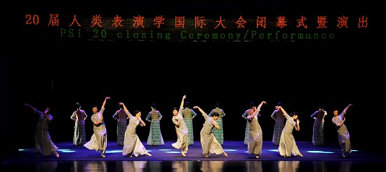 国际人类表演学会主席Maaike Bleeker女士在闭幕式即将结束时邀请孙惠柱上台代表上戏接受大会的致意。孙惠柱教授只是说了一句话:“感谢对大会给予热情支持的各位同仁,尤其是各位大学生志愿者!”话音刚落,来自上戏和上海各高校的几十位志愿者沿着两边的观众走道鱼贯而入,接受大会参与者的掌声致谢!