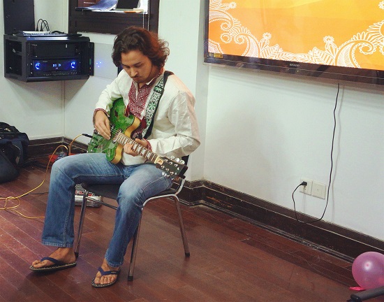 图为来自俄罗斯的留学生伊万吉他弹唱