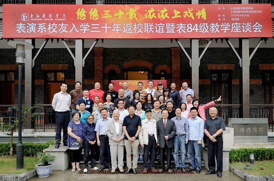 今年是上海戏剧学院表演系84级学生入学三十周年。为了回顾和纪念三十年的校友往事、梳理表演系教学的发展脉络、提升中青年教师的教学科研水平,以及更好地规划表演系未来的发展,表演系与表演系党支部在上海戏剧学院院办、教工之家、后勤处、保卫处和表演系84级教学小组的协助下,于2014年9月19日举办“悠悠三十载,浓浓上戏情——表演系校友入学三十年返校联谊暨84级教学座谈会”。表演系84级同学从世界各地赶回母校,参观校园、回顾当年大学时代的生活并补拍了师生纪念照。楼巍书记和韩生院长出席座谈会并讲话,教学座谈会由黄昌勇副院长主持。教务处长厉震林、宣传部长张生泉等也出席了座谈会。表84级班主任、表演老师张应湘,时任院长何添发,时任系主任陈明正,台词教师舒蓉,声乐教师阮尚志,文化课教师丁罗男、朱国庆等二十多名教师出席本次座谈会,畅谈表84级的教学经验与师生情谊。