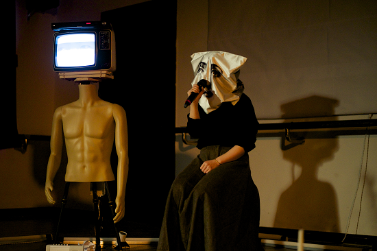 最让我印象深刻的是,演员在台上套着一个画着女人脸孔的头套,静静坐着讲话。是一种自言自语状态的讲话,而不是对话,因为得不到应答。这是一个女人,向她的丈夫或者男朋友絮絮叨叨地讲了些回忆,或者是时政。最后她说:“女人不该讲政治。”“算了,我们不说政治,或者是哲学。”这些诸如此类的话。这一段听得让人不是滋味,也许每一个女性都可能有过这样的经历。自己兴奋的说着什么,却一直得不到应答,最后声音渐弱,最后不得不给自己找一个台阶下。这种与舞台上的感同身受让人觉得亲近。