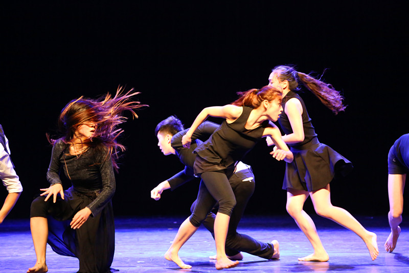 现代舞作为一种新兴的舞蹈表现形式,身体的表现属于一种美妙的肢体艺术。舞剧刚开始演员们奔跑入场,融合动感的乐符,朝气活力,似那暴风雨前的平静。乐章一转,配合着冷蓝的光打满舞台,演员们躺倒在舞台上无力举着手足,仿佛承载这社会无尽的压力。奔跑、跨越、翻转、停留,无不寓意这社会在不断进化过程中给现代人带来的难以喘息的高压生活,让他们来不及反应。这一切来的没有任何的预兆,生存其中,为了满足眼前的欲望,背叛、冷漠,不和谐的生存状态产生,演员们推推攘攘,发出恐惧的尖叫。大自然的一切无一不能舞,现代社会被舞动成横越舞台上具象的丝带,演员们舞在其中,似音符跳动在五线谱上。没有出现交响曲般和谐的律动,而是相互缠绕、纠结,不知不觉中走进了一张网,脱不开、逃不掉,无助的朝着四面八方、朝着对方嘶吼。然而骨骼支撑着肉体,就像希望支撑着精神,两名舞者被缚在丝带中间,低调的灰色让他们凝结成一座雕塑,坚韧执着于社会苦恼之中。最终,舞者躺在舞台上,温暖的黄色光打在身上,安逸而又和谐,是在纯净的精神世界中生长。