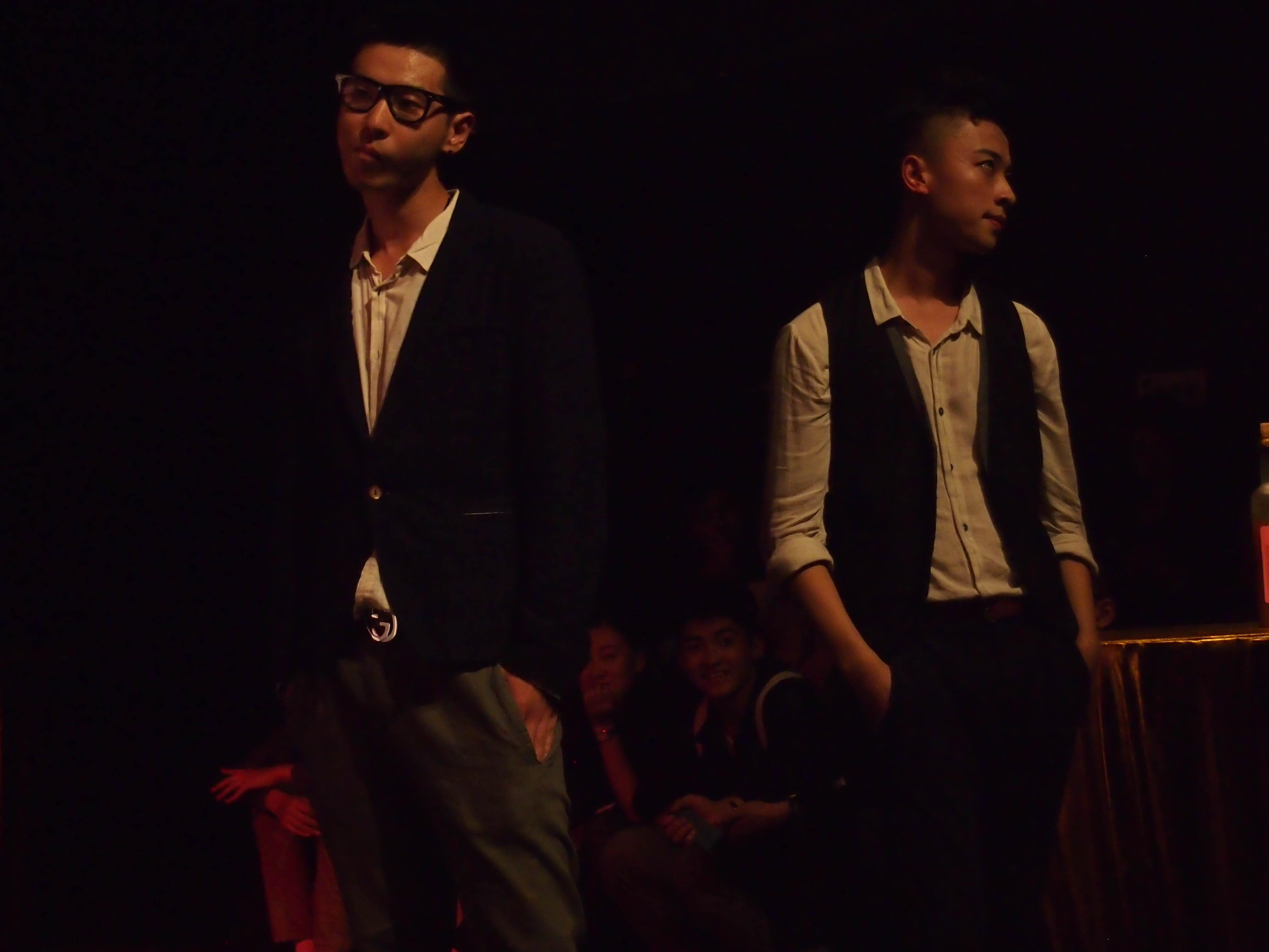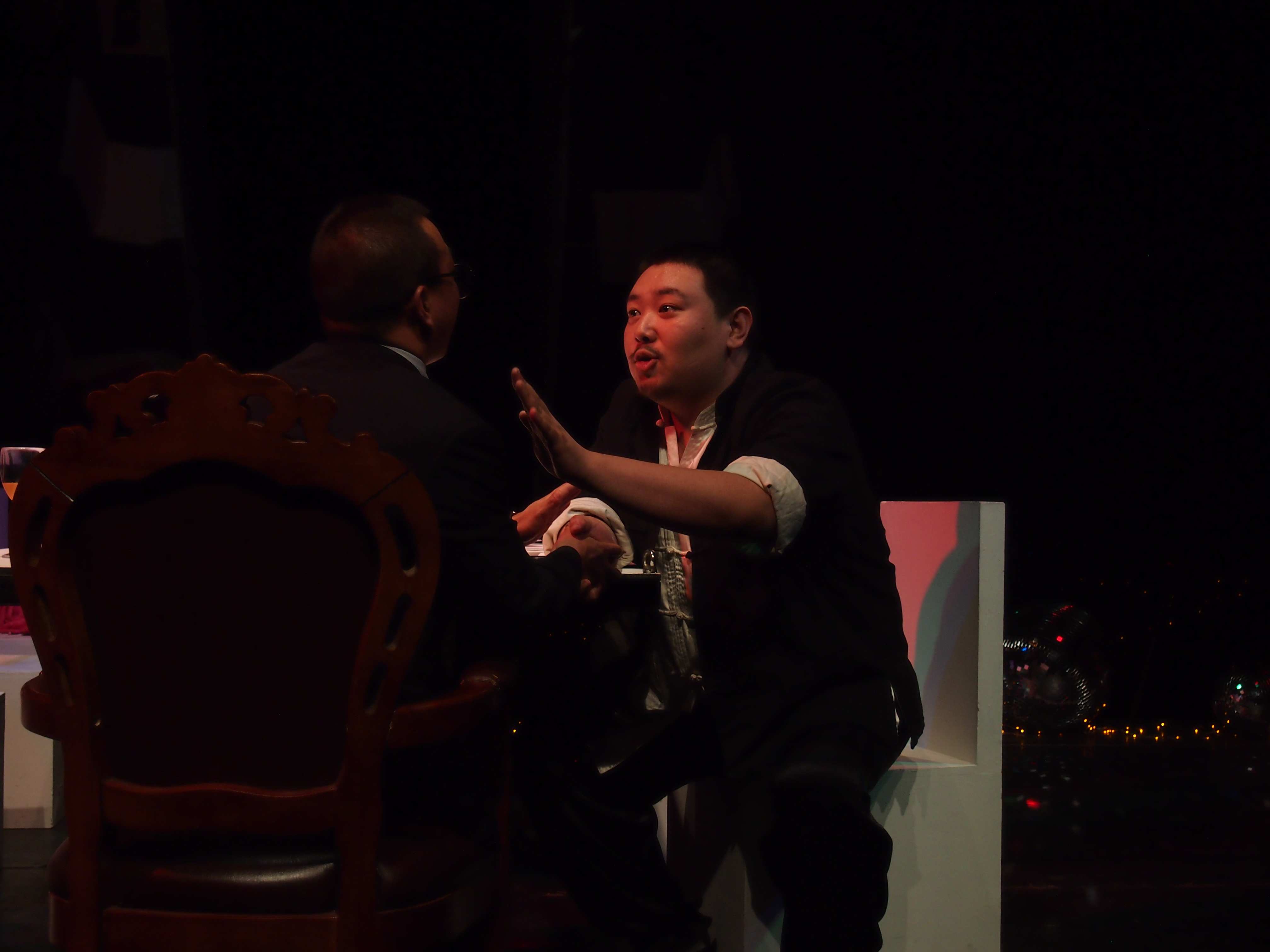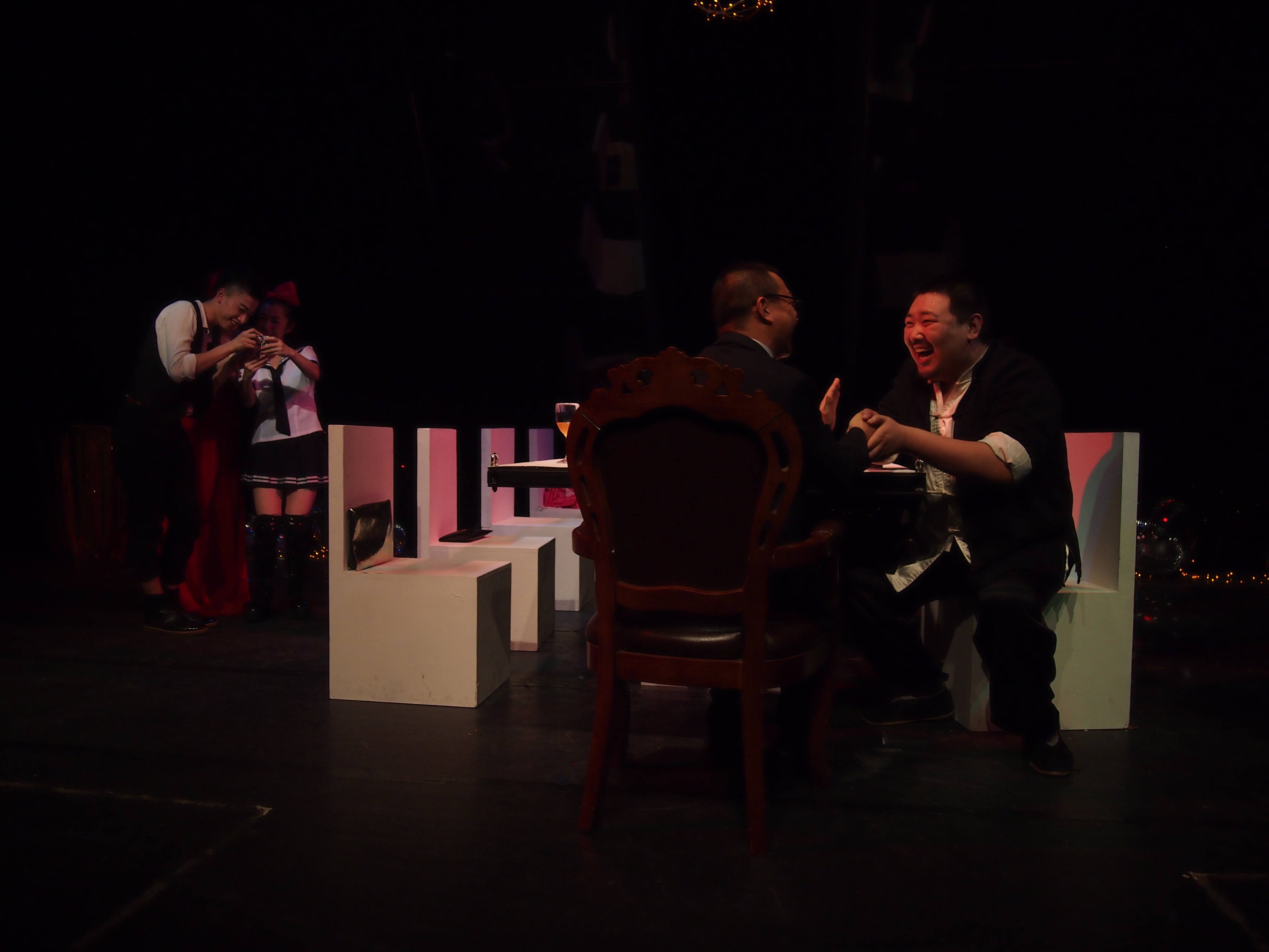 起初剧情将人们带入一个误区,让人认为M先生就在台上的七位宾客之间。随着他们虚浮的“上流社会”社交表演,为了争夺神秘大礼各怀目的的“厮杀”,人们无时无刻不在猜测究竟谁是M先生,揣测作者真正的创作意图。前三分之二的剧情都是有关动物间的弱肉强食,人性的贪婪欲望,或许有人觉得整部剧的价值观因此而变得过分拜金。各个社会阶层都是如此,他们还有个很好的面具:I’m born in this way.我们都是无辜的,是生活强奸了所有人。这种奢华萎靡杂乱的基调直到剧目快结束才停止,止于一个名媛的美甲师身份被揭穿。她堂而皇之地说着自己作为一个单身母亲希望让孩子上贵族学校的夸张愿望,这其中或许真的有一半是因为儿子,但另一半还是她不实际的虚荣心,甚至虚荣心都转移到了儿子身上。但直到她被非礼,形象设计师TOMY指出她是那么有资本,为什么不靠出卖肉体换取钱财的时候,她爆发了。这让我看到一个生活在社会下层的人物的底线,她活着,有自己不能逾越的道德底线,是无法用I’m born in this way 去说服自己换取金钱的。在她之后一个个人物相继爆发,每个角色都有自己的痛苦与挣扎,但他们通过互相指责,通过M先生适时放出的信息,被迫撕掉自己的面具,去掉了伪装。但这之后,他们发现自己一丝不挂了,不知所措的时候,屏幕上M先生放起了他们儿时的照片,母亲的照片,父亲的照片,他们还抱着一颗初心纯洁而简单时候的照片。