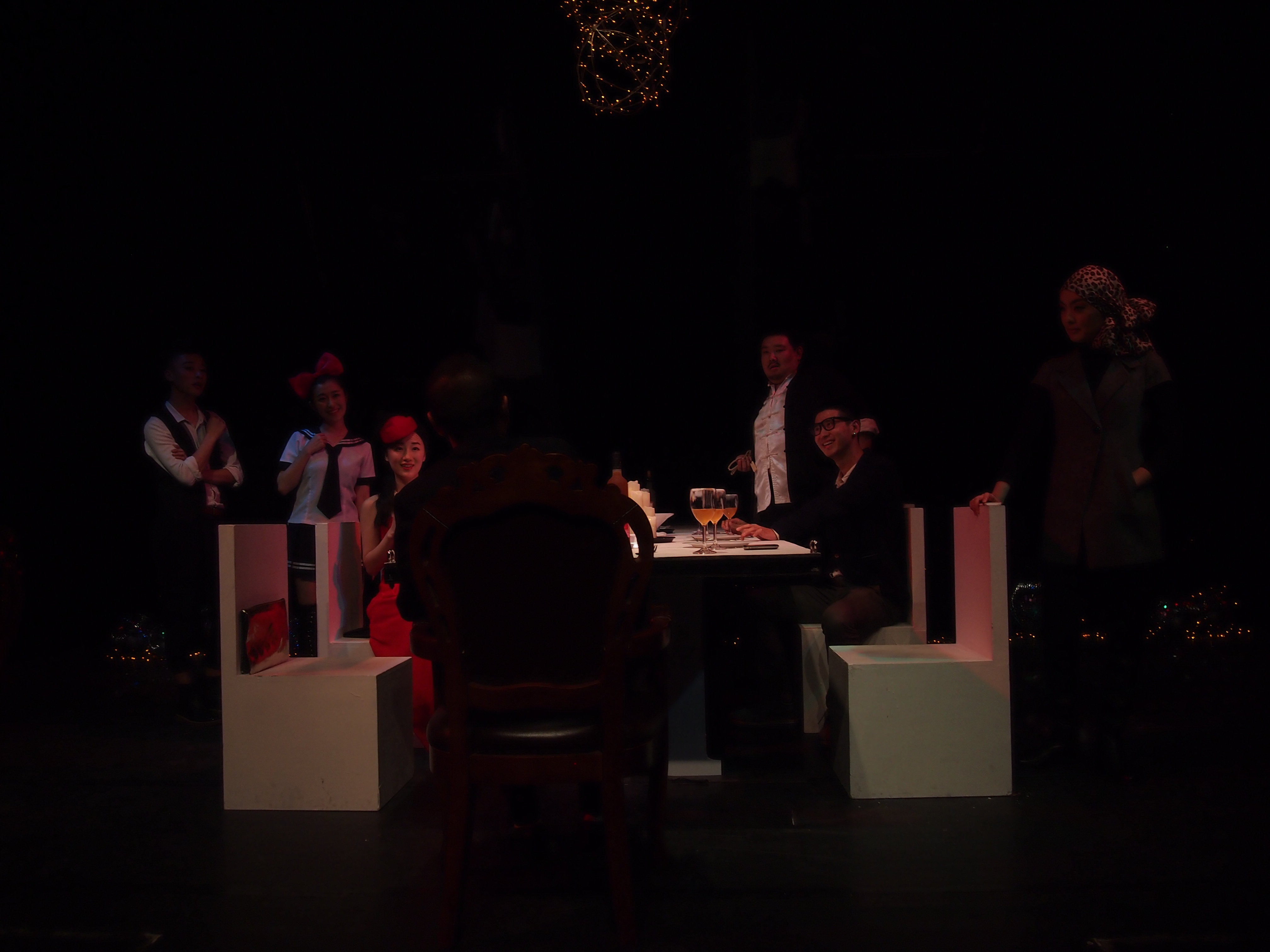 本剧是以一个真实的盛宴作为故事线索,通过扫描二维码进入微信大群,被选中的七位陌生人将成为晚宴的贵宾,而有意思的是,演员们一开始都是坐在观众席中,后来才作为宾客被叫上去的,甚至个别演员始终在台下与台上演员互动。这非常好的起到了将整个黑匣子融为一体,将舞台蔓延到整个空间的效果。使得观众们身临其境,将自己带入到剧情中间去。