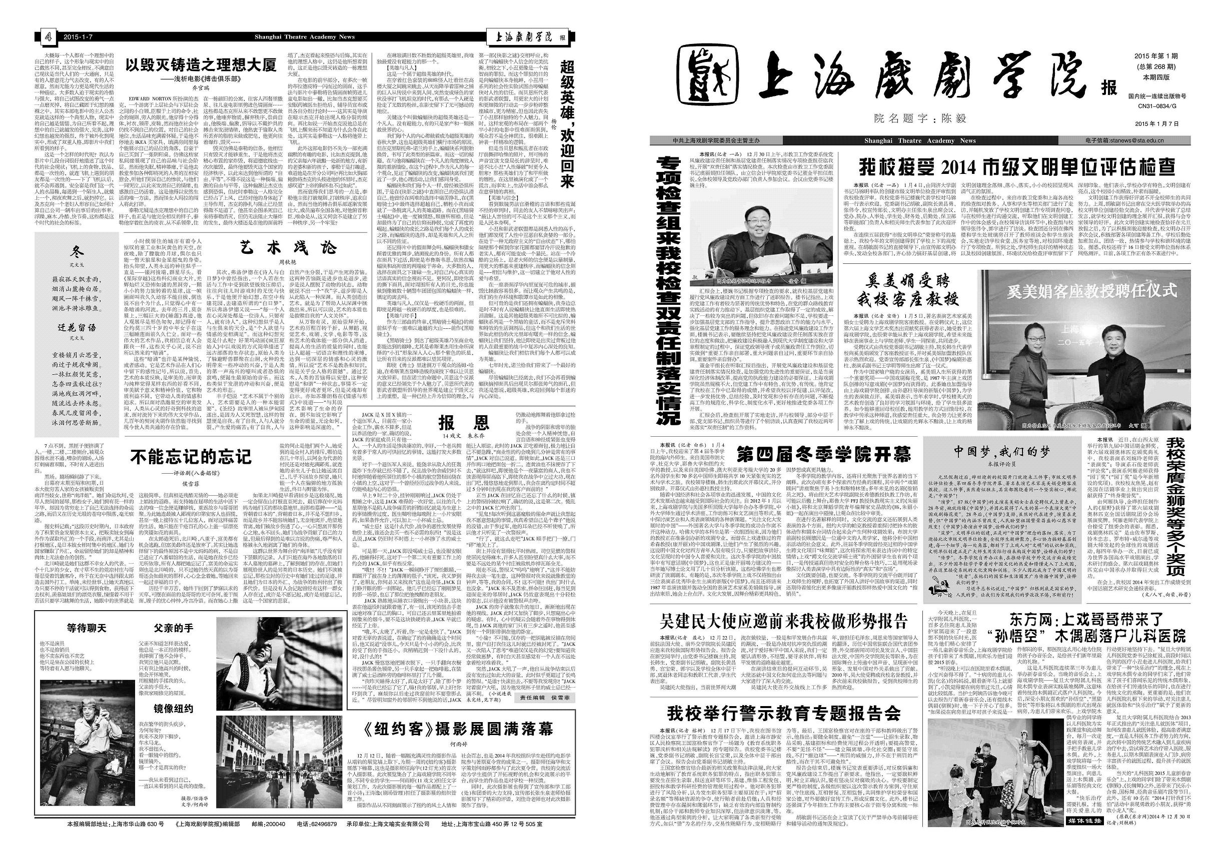 《上海戏剧学院报》2015年第1期(总第268期)已于2015年1月7日出版,本期共四版。重点内容有:《专项检查组来我校检查双责任制落实情况》、《我校接受2014市级文明单位评估检查》、《奚美娟受聘我校客座教授》、《第四届冬季学院开幕》等。敬请关注,也可点击下载阅读。(文、图、编辑:佳奇)点击下载: 《上海戏剧学院报》2015年第1期(总第268期)