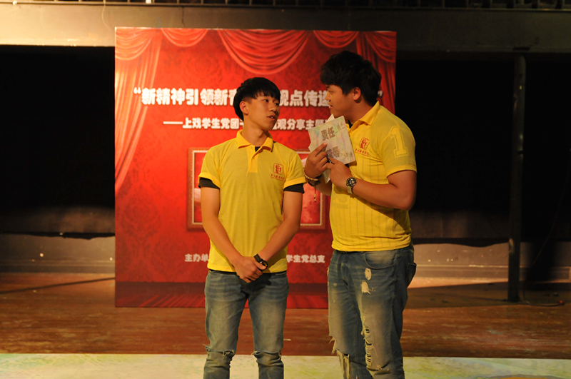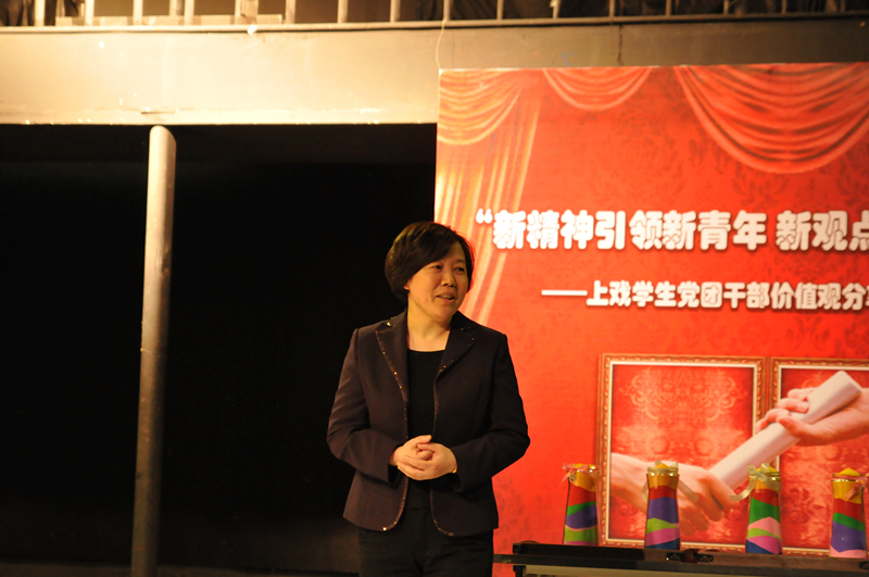 2015年5月4日下午,为传承和弘扬“爱国、进步、民主、科学”的“五四”精神,由学工部、团委、学生党总支主办的“新精神引领新青年,新观点传递新能量”上戏学生党团干部价值观分享主题活动在红楼黑匣子举行。党委副书记胡敏、学工部部长徐咏、学生党总支副书记姚远、研究生部学生党支部书记李冬梅、创意学院学生党支部书记亓季松等领导和老师出席活动。