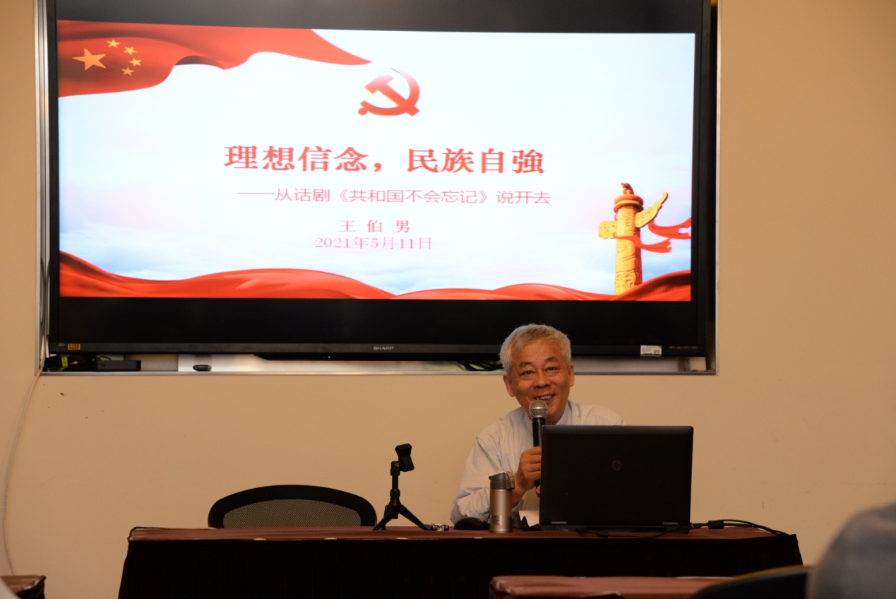 王伯男教授曾经创作了《共和国不会忘记》《寻找师昌绪》《甲午祭》《东征》等话剧作品。他在创作过程中,查阅了大量的历史文献资料。党课上,他结合自身的创作经历向老党员们介绍了关于“两弹一星”科学家的名人轶事、介绍了从两次鸦片战争到中日甲午海战的历史背景和国情、介绍了中国共产党领导全国人民进行新民主主义革命的曲折历程。