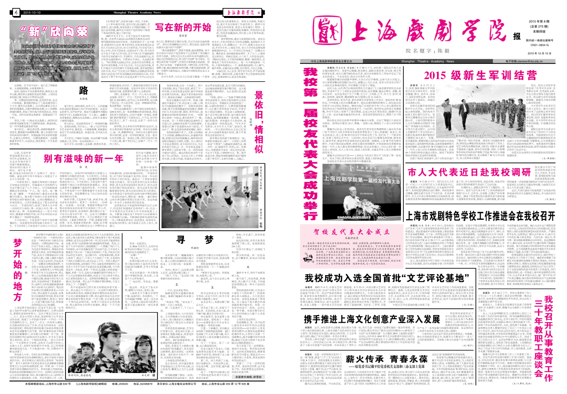 《上海戏剧学院报》2015年第8期(总第275期)已于2015年10月10日出版,本期套红,共四版。重点内容有:《我校第一届校友代表大会成功举行》、《2015级新生军训结营》、《市人大代表近日赴我校调研》、《上海市戏剧特色学校工作推进会在我校召开》等。敬请关注,也可点击下载阅读。(文、图、编辑:榕树)