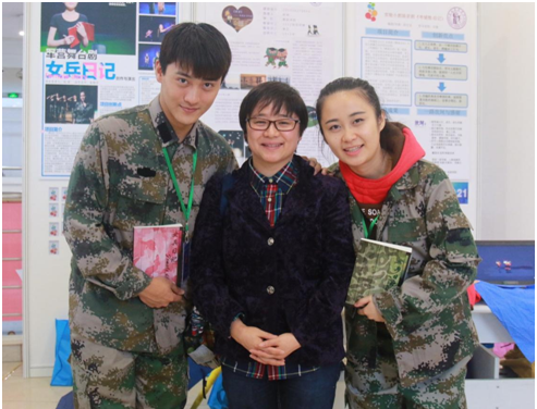 图为指导教师朱锦华与《女兵日记》主创戏文系赵颖、戏曲学院徐鸣捷合影