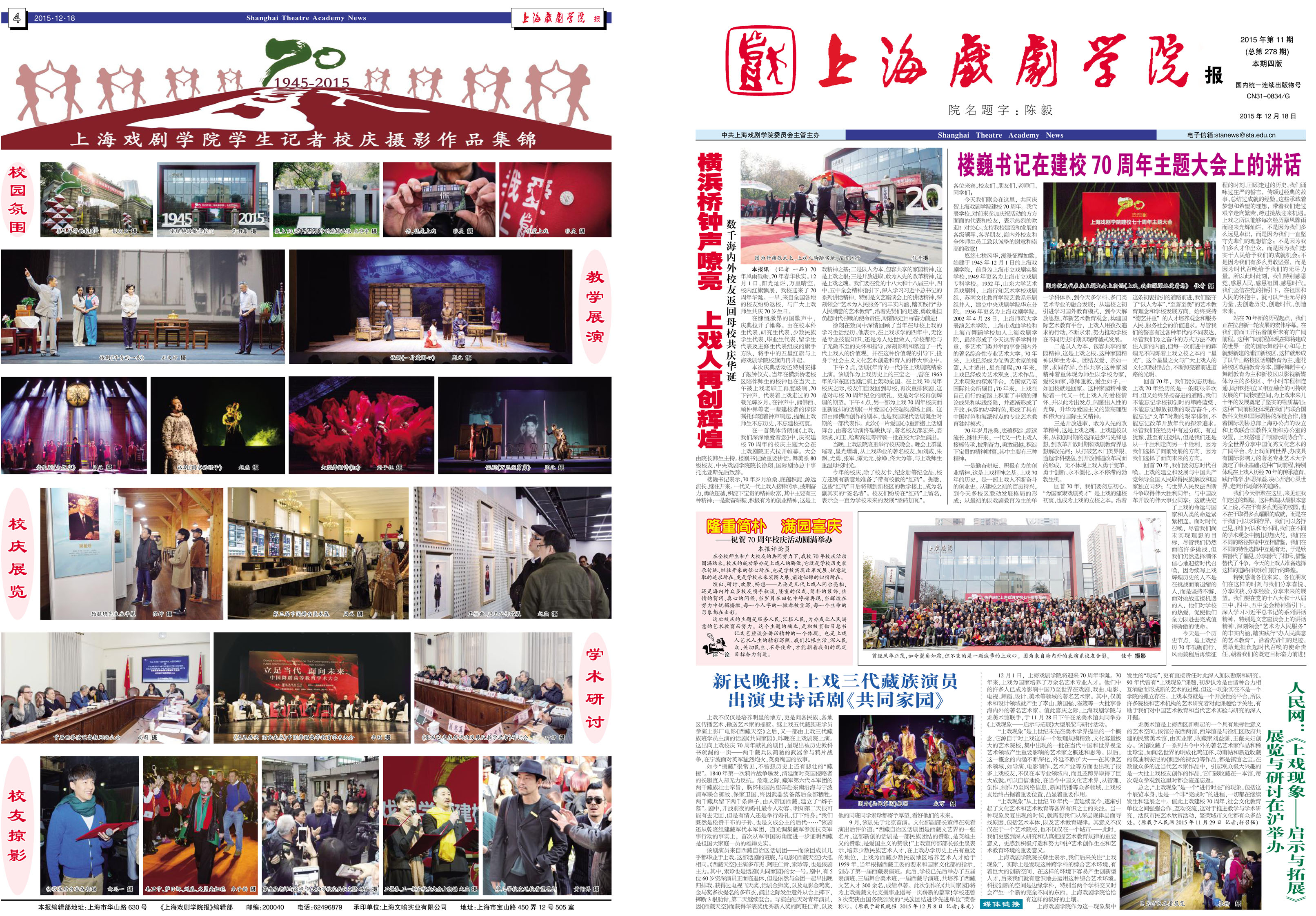《上海戏剧学院报》2015年第11期(总第278期)已于2015年12月18日出版,本期一、四版为彩版,共四版。重点内容有:《横浜桥钟声嘹亮 ,上戏人再创辉煌》、《楼巍书记在建校70周年主题大会上的讲话》、《新民晚报:上戏三代藏族演员出演史诗话剧<共同家园>》、《人民网:<上戏现象——启示与拓展>展览与研讨在沪举办》等。敬请关注,也可点击下载阅读。(文、图、编辑:佳奇) 点击下载: 《上海戏剧学院报》2015年第11期(总第278期)