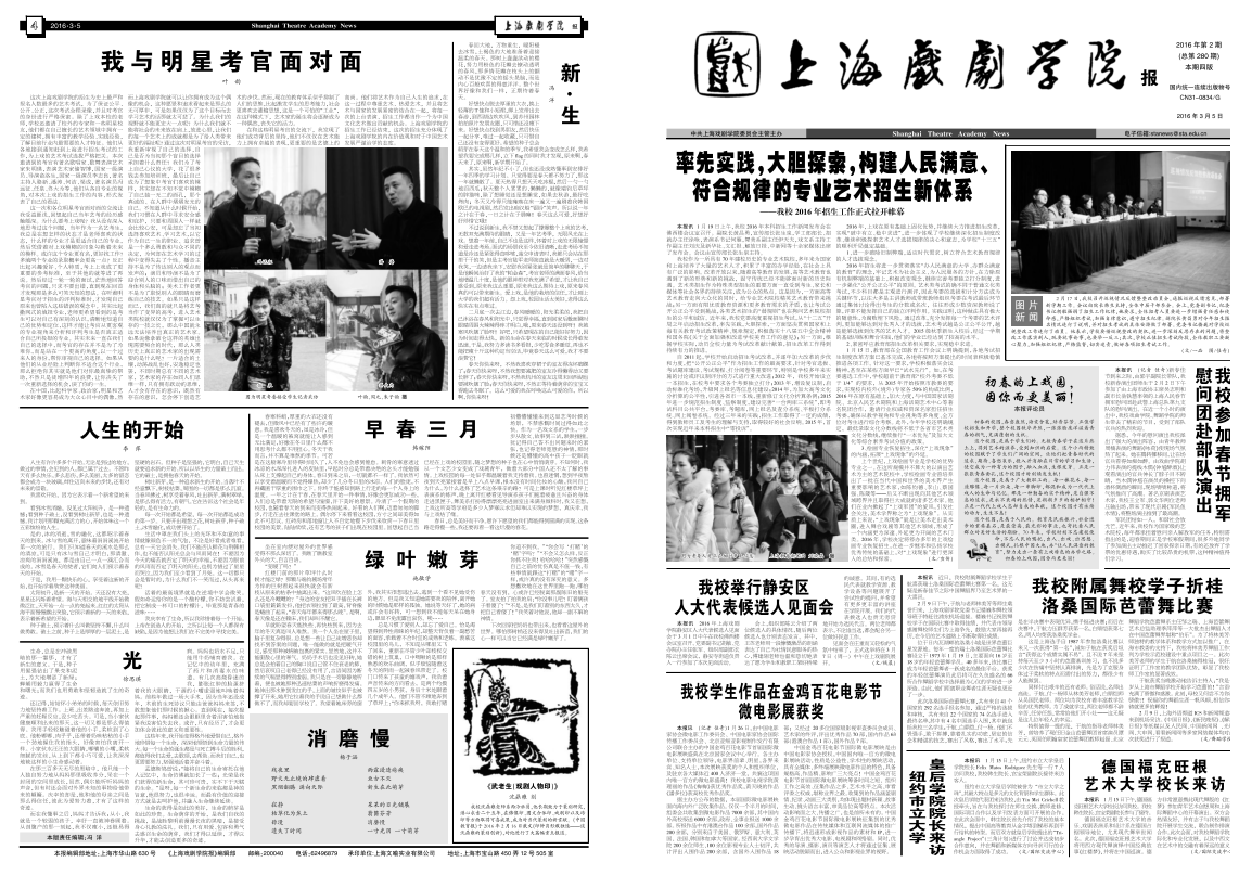 《上海戏剧学院报》2016年第2期(总第280期)已于2016年3月5日出版,本期共四版。重点内容有:《率先实践,大胆探索,构建人民满意、符合规律的专业艺术招生新体系——我校2016年招生工作正式拉开帷幕》、《我校参加春节拥军慰问团赴部队演出》、《我校举行静安区人大代表候选人见面会》、《我校学生作品在金鸡百花电影节微电影展获奖》、《我校附属舞校学子折桂洛桑国际芭蕾舞比赛》等。敬请关注,也可点击下载阅读。(文、图、编辑:榕树) 点击下载: 《上海戏剧学院报》2016年第2期(总第280期)