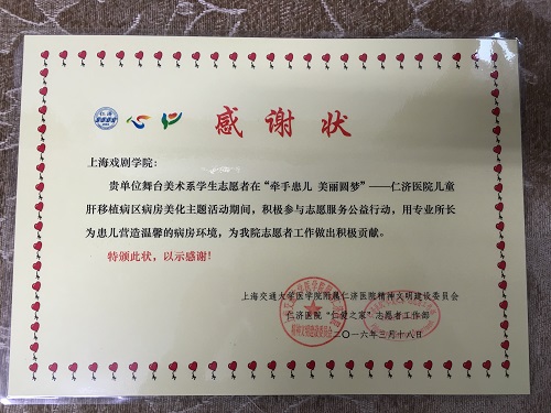 近日,上海交通大学附属仁济医院给我校发来感谢信,对我校舞美系学生志愿者的志愿服务行动表示感谢。信中写道: