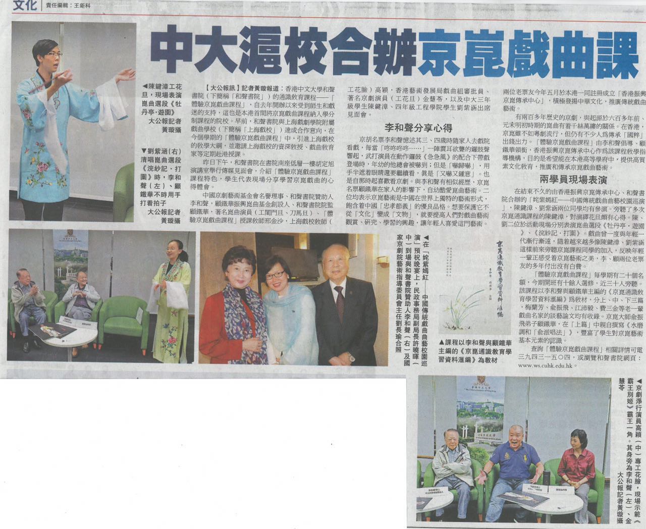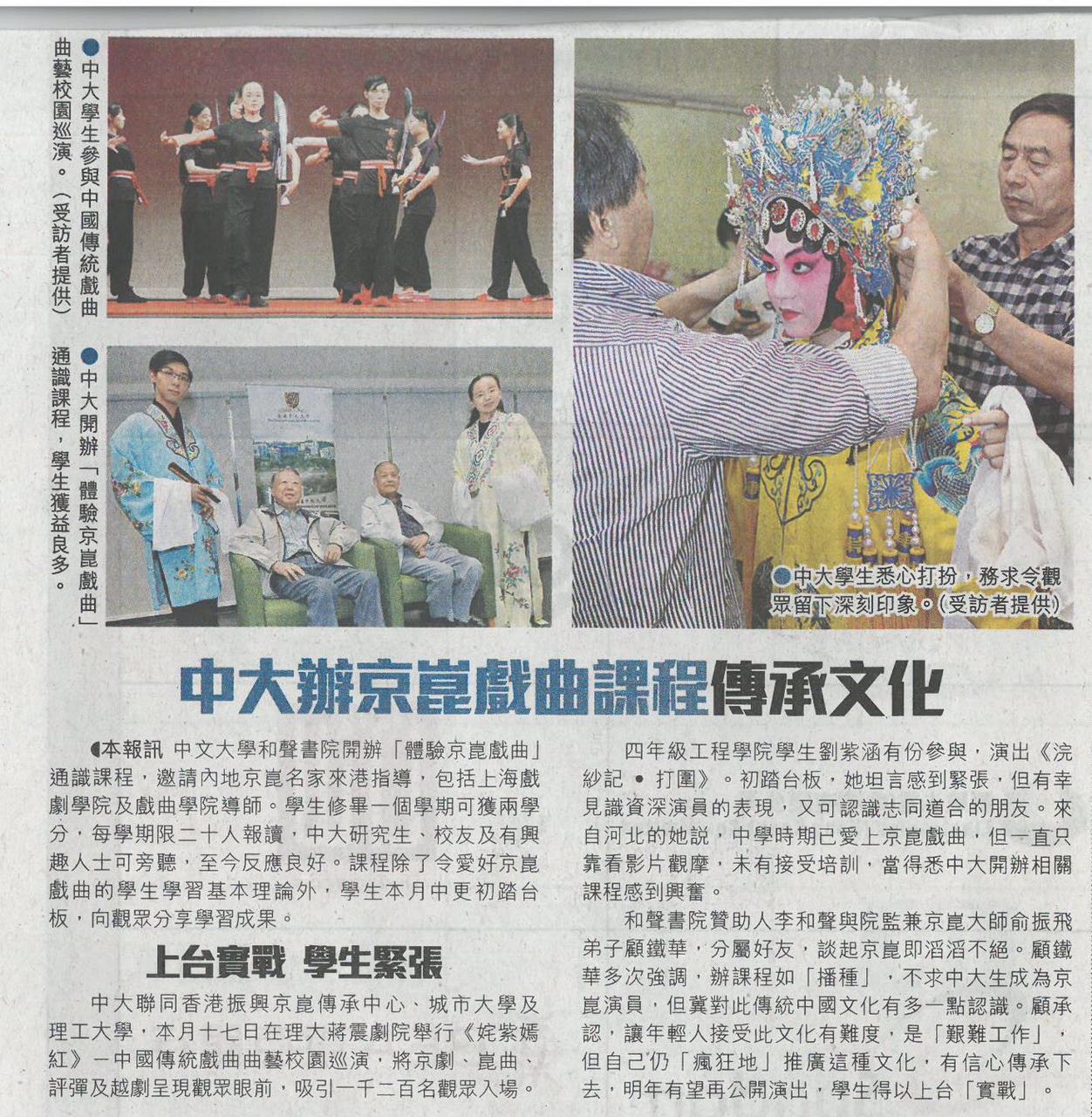 京昆通识课程作为香港首个由大学开办�以实践为主之京昆体验课程,自2014年,由香港中文大学和声书院、香港振兴京昆传承中心牵头,采取与上海戏校合作办学的模式,教学反响斐然,并于2015年开始香港中文大学正式将该课程纳入学分制的《通识课程——体验京昆戏曲课程》。该课程教导京昆剧的发展,各行当的唱、念、旦角生角的表演身段(手、眼、身、法、步)动作等,使学生了解并初步掌握京剧、昆曲演唱的基本知识和基本技巧,举办传统戏曲曲艺香港校园巡演等活动,学生亦有机会参与大型演出,一尝在真正舞台演出的机会。在一年多来的实践中,双方合作融洽,教学成果卓著,深得香港中文大学京昆通识课程学员们的肯定与赞赏。