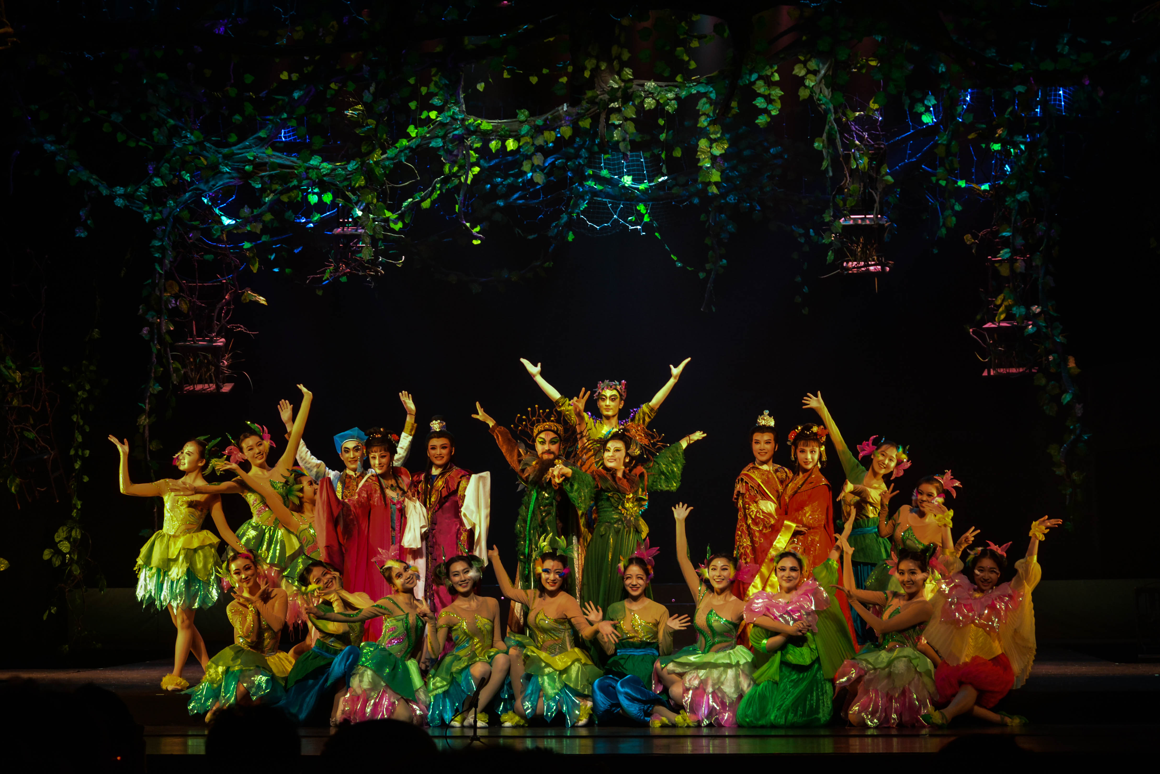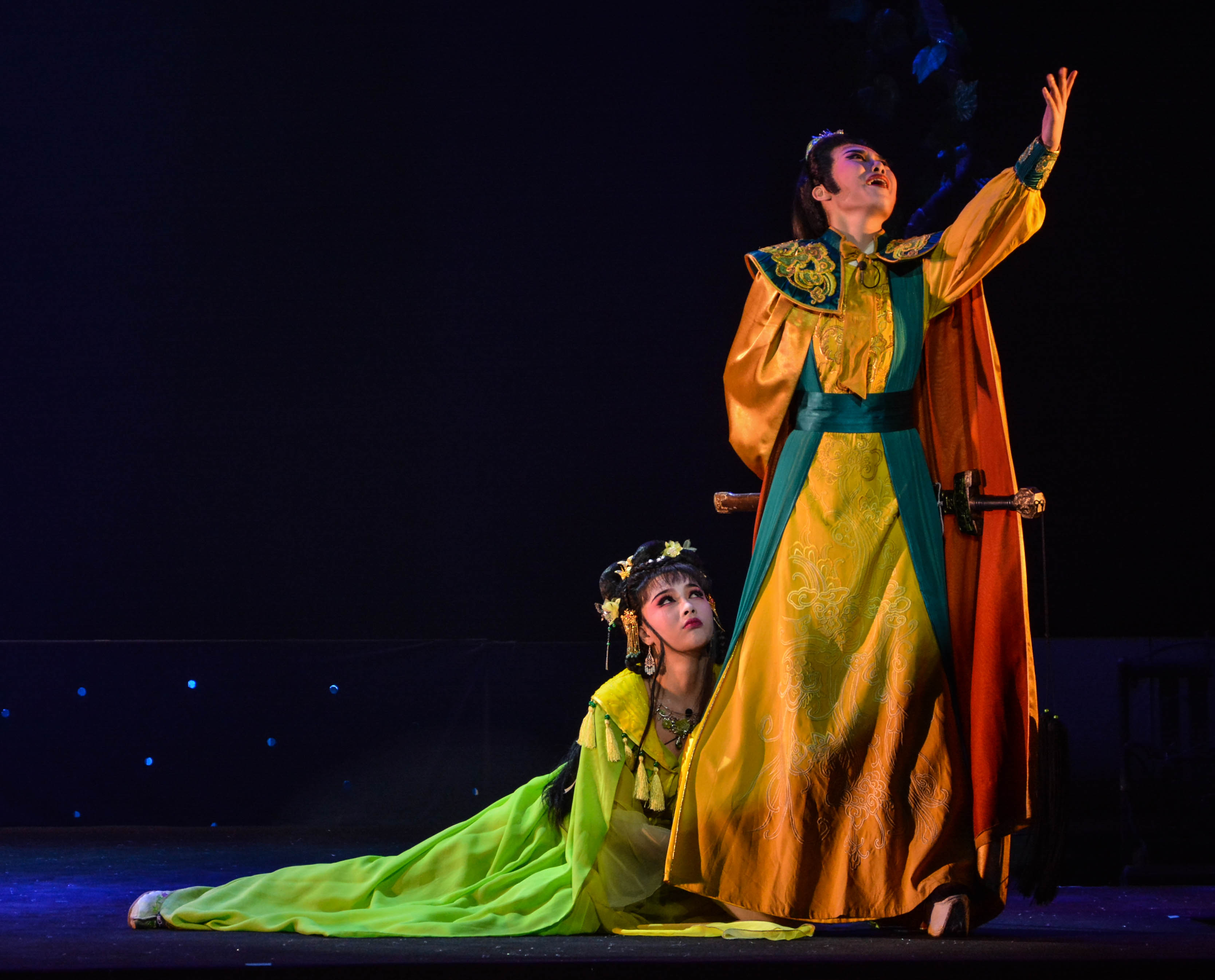 本剧舞台效果别出心裁,以神秘的蓝绿色灯光映射交织并配以缠绕的树叶,巧妙的营造出繁星点点的夏夜,如梦如幻。演员们独具特色的越剧唱腔,是天堂来的莺声燕语,时而质朴细腻,时而委婉深沉,把观众一下子带进了那个唯美迷幻的梦境里,自在飞花轻似梦,无边丝雨细如愁。水袖、云肩、靴鞋,将这些具有越剧特色的服装结合西方爱情故事,精美别致,也极具亮点。