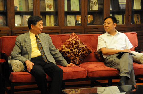 图为吴建民大使与楼巍书记亲切交谈