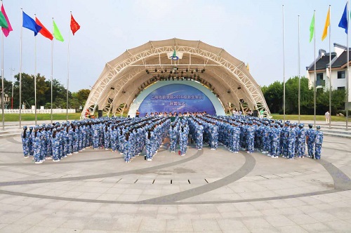 开营仪式在庄严的迎国旗、升国旗仪式中正式开始,全体新生在教官的带领下面向国旗庄严宣誓。副院长张伟令向东方绿舟承训总教官李庆伟授旗。东方绿舟副主任、上海市国防教育中心主任吉峰教官作了开营动员讲话,吉教官向大家介绍了军事文化和营地文化,并宣布了教官组成人员名单,他要求同学们刻苦训练,在教官的指导下圆满完成军训任务。