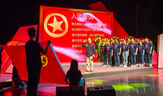 安振吉老师朗读结束后,还带领主持班15级、16级同学一起重温入团仪式,共同读出入团誓词,场面热烈、激动人心。这一环节更是提醒同学们要不忘初心,始终做有责任心的人。