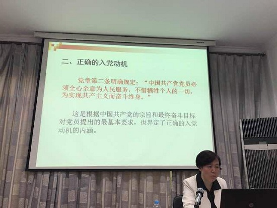 党委副书记胡敏以“端正入党动机”为题,指出正确的入党动机是入党的首要条件,她围绕什么是入党动机、正确的入党动机、端正入党动机重要性、怎样端正入党动机等几个方面作了深入的阐释。告诫年轻人入党的严肃性与所要承担的责任,真正明白加入中国共产党是为了献身共产主义事业,为了更好地为人民服务。