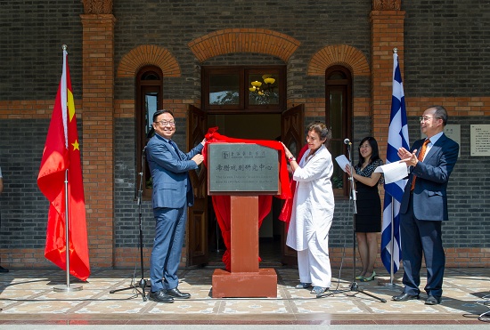 图为Lydia Koniordou部长与楼巍书记为我校希腊戏剧研究中心揭牌