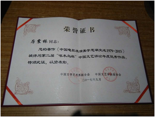 此外,厉震林教授近期先后因论文《中国电影转型升级的“高教”板块》荣获第26届中国金鸡百花电影节“优秀学术论文”,因著作《中国电影表演美学思潮史述(1979-2015)》荣获中国文联、中国评协第二届“啄木鸟杯”中国文艺评论年度优秀作品,其前身为中国文联文艺评论奖,系国家级中国文艺评论最高奖。(文、图:电影学学科 编辑:榕树)