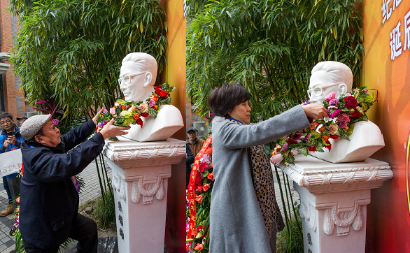 图为嘉宾代表向朱端钧先生的塑像致敬并献上花环