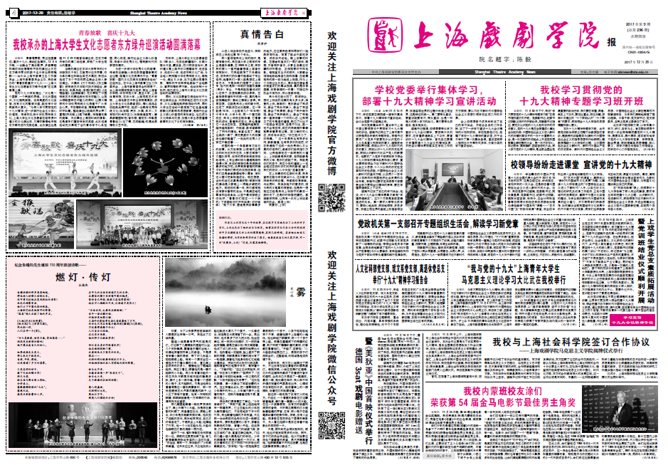 《上海戏剧学院报》2017年第9期(总第296期)已于2017年12月20日出版,本期套红,共四版。重点内容有:《学校党委举行集体学习,部署十九大精神学习宣讲活动》《我校学习贯彻党的十九大精神专题学习班开班》《校领导纷纷走进课堂 宣讲党的十九大精神》《我校内蒙班校友涂们荣获第54届金马电影节最佳男主角奖》等。敬请关注,也可点击下载阅读。(文、图、编辑:榕树)