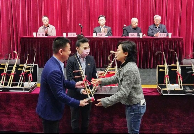 (上海戏剧学院附属戏曲学校领导接受捐赠的京胡)