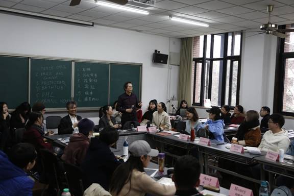 本堂公开课分为三个部分,黄教授首先回顾了9号下午观看的上戏编剧学研究生英文千字剧剧本朗读会,紧接着带领同学进行一小时即兴写作练习,最后剩余半小时用来回答现场学生的提问。