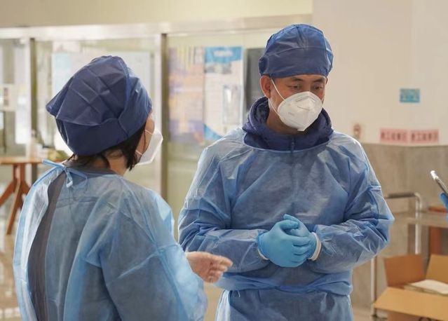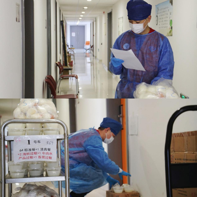 送餐按照楼层进行发放,两名志愿者为一组,一名负责发放固定数量的标准餐和筷子,另一名负责发放米饭和水果。并且确保在二十分钟内,高效有序地将所有标准餐发放完毕,配合默契,做到“0接触”“0失误”。