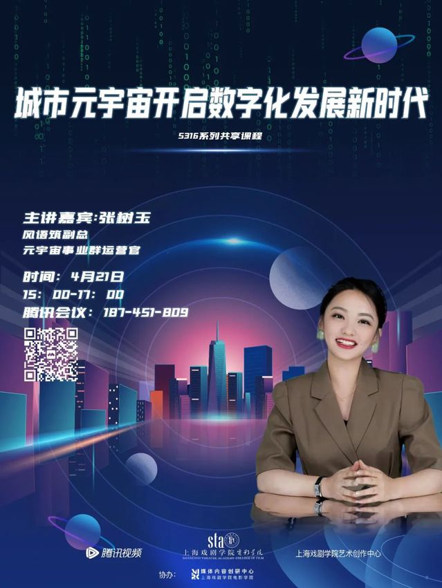 2022年4月21日,由上海戏剧学院电影学院主办的5316系列共享课程、广播电视编导专业影视创作系列讲座“城市元宇宙开启数字化发展新时代”如期于线上顺利开展。讲座特邀风语筑副总经理,元宇宙事业群首席运营官张树玉进行讲演,主要面向电影学院广播电视编导专业学生,同时吸引了校内外师生及学者的踊跃参与。