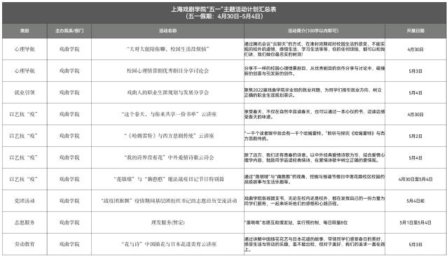系列活动一经推出,迎来了诸多同学的关注,每一场活动同学们的参与度都很高。戏曲学院本次五一系列主题活动包含9个主题活动,其中有心理导航——“大哥大姐陪你聊,校园生活无烦恼”活动、校园心理情景剧优秀剧目分享讨论会;以艺抗“疫”——“这个春天,与你来共享一份书单”“《哈姆雷特》与西方悲剧传统”等云讲座,“我的诗界没有花”中外爱情诗歌云诗会,以及“莲墩墩”与“藕憨憨”魔法战疫日记节日特别篇;劳动教育——“花与诗”中国插花与日本花道美育云讲座;党团活动——“战疫团旗飘”疫情期间基层团组织书记志愿经历交流活动,以及戏曲人的职业生涯规划与发展分享会。此外,还召开了两场戏曲学院全体学生大会。
