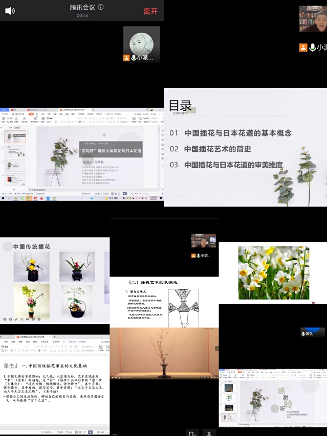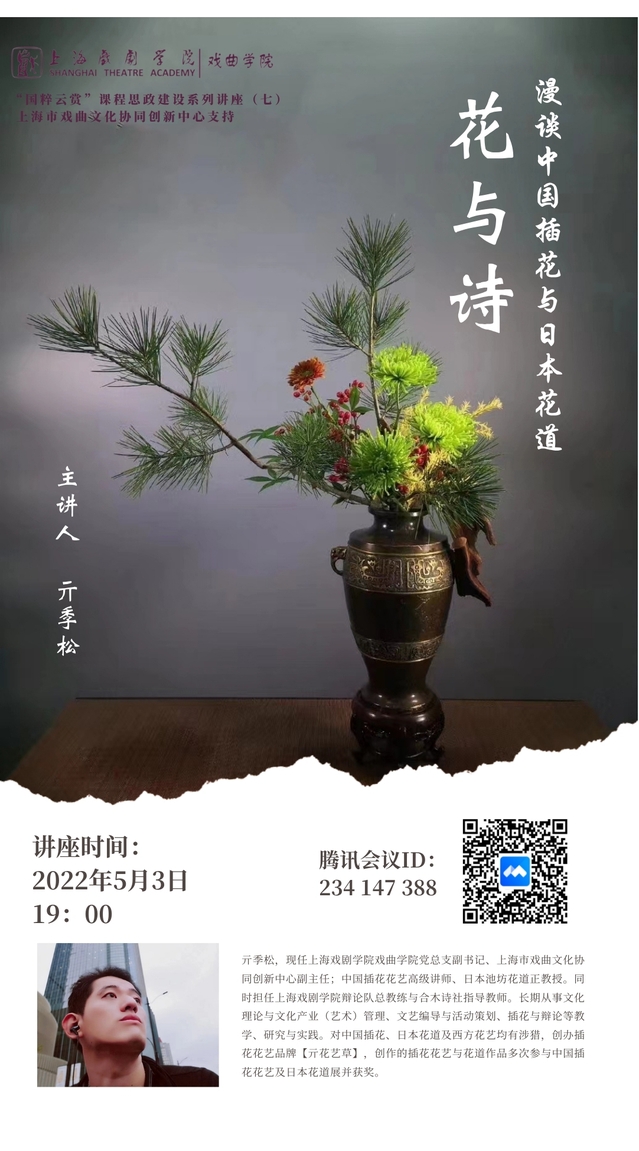 除此之外,5月3日,戏曲学院党总支副书记亓季松为同学们带来了一场“花与诗”中国插花与日本花道美育云讲座,他从中国插花与日本花道的基本概念、中国插花艺术简史和中国插花与日本花道审美维度几个方面,为同学们做了较为详细的介绍。