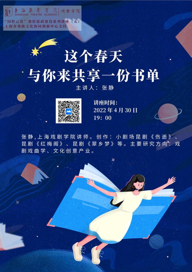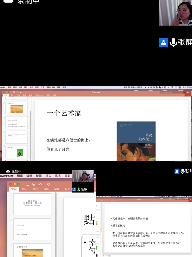 作为课程思政系列讲座的一部分,4月30日到5月3日,戏曲学院开展了三场别开生面的思政系列讲座,三场讲座引起了同学们的广泛关注,还有其他院系的同学也参与到了讲座活动中。首先是4月30日,由张静老师为我们带来了一场名为“这个春天,与你来共享一份书单”的云讲座,给同学们依次推荐了《牧羊少年奇幻之旅》《苏菲的世界》和《月亮与六便士》这几本书,在与同学们分享书单时,张静老师声情并茂,娓娓道来,同学们听得很入迷,伴随着书中那些美好的故事,同学们沉浸在一片诗与远方的世界里,同学们的情绪得到了一丝放松。