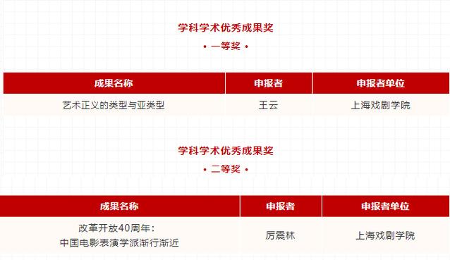 上海戏剧学院有两项目成果进入表彰名单,分别是王云教授的《艺术正义的类型与亚类型》(学科学术优秀成果奖论文类一等奖)和厉震林教授的《改革开放40周年:中国电影表演学派渐行渐近》(学科学术优秀成果奖论文类二等奖)。