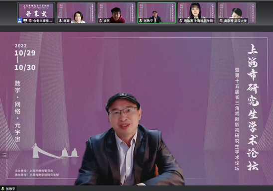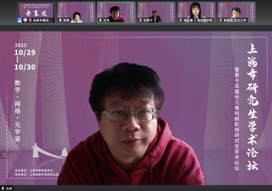 10月29日上午,论坛开幕式如期而至。上海戏剧学院研究生部主任沈亮教授、专家代表张敬平教授出席论坛开幕式,开幕式由研究生部韩爽老师主持。沈亮教授代表上海戏剧学院对所有参会的研究生表示欢迎,并进行了开幕致辞。他指出,本届论坛的主题“数字·网络·元宇宙”正是当今社会发展的主要趋向,艺术与高新科技的融合迫在眉睫,急需年轻一代在这一领域付诸努力与实践。