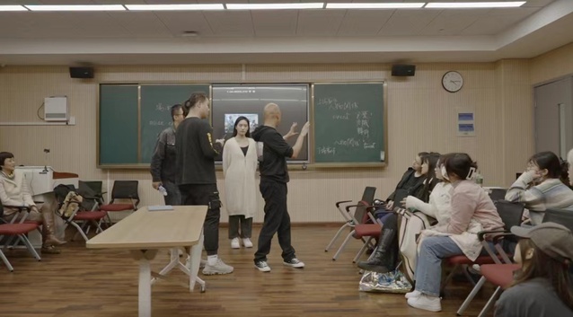 郑大圣导演首先讲述了“场面调度”这一词汇的来源和发展历史,为同学们生动地梳理了“场面调度”从一个最原始的基本动作,是如何在媒介发展过程中不断累积、嬗变为有理论、有体系、有诉求、有变奏的美学方向这一整体过程。郑大圣导演认为,拍摄现场就是一次次地面对和处理“场面调度”,故而对于“场面调度”的学习与训练,是作为拍摄实践中必不可少、且需要日积月累的一项功课。紧接着,郑大圣导演组织了三组同学进行现场拍摄训练,要求围绕“yes/no”的任意对话组合,在3分钟的拍摄时间内呈现场面调度的无限可能。经过激烈的讨论与准备,三组同学分别呈现了有关科幻类以及家庭伦理类的拍摄片段,整体设计和现场展示十分精彩有趣。而后,郑大圣导演一一点评了同学们的现场拍摄训练,提出场面调度的三个行为:即表演的行为、摄影机的行为以及被暗含着的剪接的行为。并且通过现场复盘讲解,为同学们详细剖析了围绕这三个行为而生发出的人物关系建构、时间空间建构之间的细微差别。