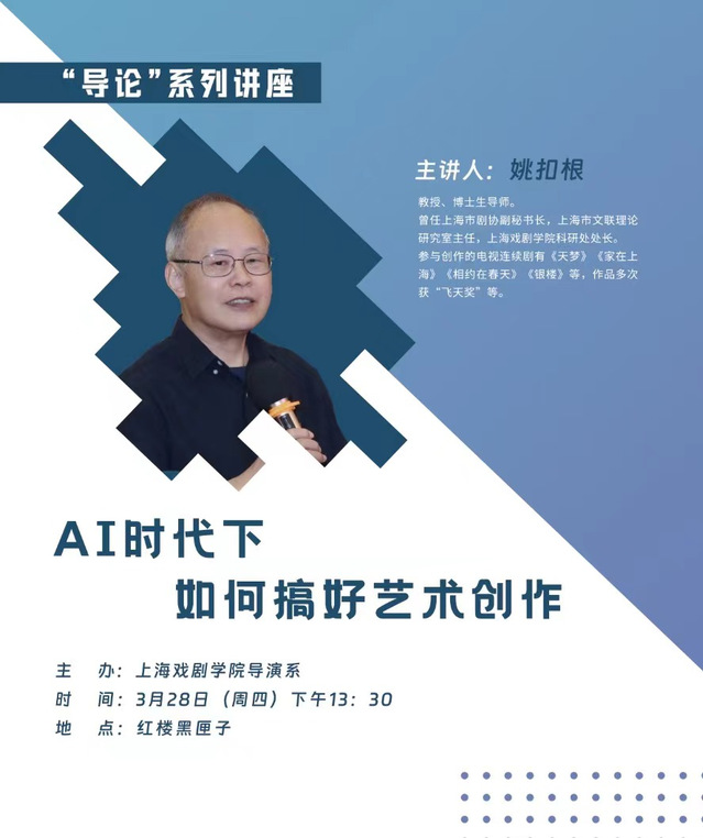 为落实《关于全面深化高等教育综合改革服务促进高质量发展的意见》,围绕服务促进国家和上海未来产业发展,前瞻布局未来学科、以人工智能(AI)赋能学科专业改革,推动传统学科专业转型升级。3月28日,导演系党总支书记尹悦蓉邀请了上海戏剧学院资深教授、博士生导师姚扣根给全系师生开展“AI时代下如何搞好艺术创作”的讲座,就时代热题展开阐释,这也是“导论”系列讲座2024年第一讲。