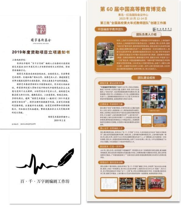 “百·千·万字剧”编剧工作坊由上海市文史研究馆馆员、上海戏曲学会会长、国家“WR计划”教学名师、上海戏剧学院学术委员会主任陆军教授在2015年创立。工作坊除了在全国相关高校与文化艺术机构推广,还连续9年为上海大中小学校举办培训班,培养了一批青年编剧,孵化了一批优秀作品,并先后获得包括国家艺术基金艺术人才培养资助项目、全国艺术硕士专业学位研究生在线示范课程等在内的十多个教育教学类荣誉与项目资助。工作坊配套课程《编剧概论》获首批国家级一流本科课程(2020),配套教材《编剧理论与技法》获首批上海高等教育精品教材(2021),著者陆军教授获首届全国教材建设先进个人(2021)。2023年,陆军教授领衔的由本工作坊教学团队为核心成员的上海戏剧学院中国编剧学教师团队获批第三批“全国高校黄大年式教师团队”。