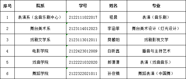 根据《财政部 教育部 人力资源社会保障部 退役军人部 中央军委国防动员部关于印发<学生资助资金管理办法>的通知》(财教〔2021〕310号)、《教育部 财政部关于印发<本专科生国家奖学金评审办法>的通知》(教财函〔2019〕105号)、《上海市教育委员会 上海市财政局 上海市退役军人事务局 上海市人民政府征兵办公室关于印发<上海市普通高等学校学生资助资金管理实施办法>的通知》(沪教委规〔2025〕8号)、《上海市教育委员会关于下达2025年学生资助补助计划(高等教育)的通知》(沪教委学〔2025〕45号)、《上海戏剧学院本科生国家奖学金管理办法》(上戏院发〔2025〕19号)等文件精神,本着“公平、公正、公开”原则,经过学生自主申请、二级院(系)审核推荐、学生处复核、校奖学金评审委员会和领导小组集体审议,拟推荐以下6名同学获得本科生2024-2025学年国家奖学金。