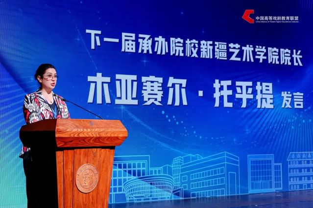 新疆艺术学院院长木亚赛尔·托乎提在讲话中表示,成为2026年交流活动的承办院校深感荣幸与责任。作为全国八所综合艺术院校之一、西北地区唯一综合性高等艺术学府,新疆艺术学院建校六十余年来,培养了一批批扎根边疆、服务全国的戏剧人才,并用作品讲述边疆故事,以艺术传递时代声音。接下来的一年里,新艺将以“高标准筹备、高质量呈现”为目标,充分发挥边疆多元文化优势,统筹办学资源,全力以赴承办第十三届中国高等戏剧教育联盟交流活动暨第七届大学生戏剧展演活动,并以活动为纽带,推动边疆戏剧教育与全国优质资源深度对接,为联盟成员搭建广阔的交流合作平台,与联盟各成员单位一道,坚守为党育人、为国育才初心使命,在戏剧人才培养、剧目创作创新、学科体系建设上持续探索,让戏剧艺术在服务国家文化战略、促进各民族文化交流中绽放更耀眼的光芒。