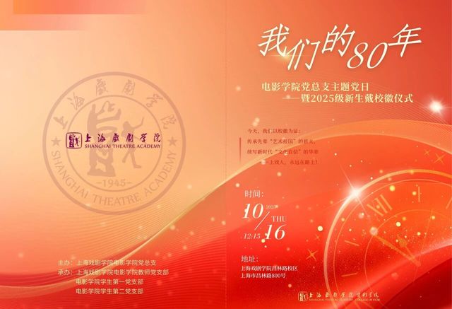 10月16日,上海戏剧学院电影学院“我们的80年”主题党日暨2025级新生戴校徽仪式隆重举行。这不仅是一场新生入学教育,更是一堂融合了党史、校史、院史与艺术理想的“大思政课”。上海戏剧学院党委副书记、副院长徐咏,上海戏剧学院原副院长、电影学院创始人之一张仲年,以及来自校地共建单位的领导嘉宾与学院师生齐聚一堂,共同见证2025级新生正式成为“上戏人”的神圣时刻。