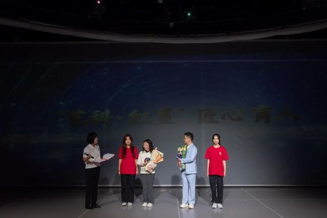 活动高潮出现在“传薪·新时代青年的精神远征”篇章。艺术科技与管理学院党总支隆重举行了师生结对“星火传递”和“艺科·红星”宣讲团成立仪式。校党委副书记胡敏,党委常委、组织部部长刘春友为结对师生递上“星星”,结对师生在全场的见证下共同点亮象征着理想信念的“艺科红星”,寓意着红色基因的传承和精神火种的燎原。“艺科·红星”宣讲团由党员导师和优秀学生党员组成,旨在运用专业所长,以青年视角和数字化的创新表达方式,讲好党的故事、传承红色基因、弘扬时代新风。宣讲团的首场微宣讲《艺科红星·艺心向党》,以青春之声传递着红色的信仰。