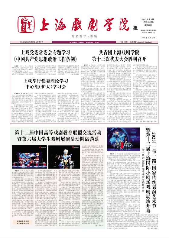 《上海戏剧学院报》2025年第6期(总第359期)已于2025年10月30日出版。重点内容有:《上戏党委常委会专题学习<中国共产党思想政治工作条例>》《上戏举行党委理论学习中心组(扩大)学习会》《共青团上海戏剧学院第十三次代表大会胜利召开》《第十二届中国高等戏剧教育联盟交流活动暨第六届大学生戏剧展演活动圆满落幕》《2025“一带一路”国家传统表演艺术节暨第十三届上海国际小剧场戏剧展演开幕》等。敬请关注,也可点击下载阅读。(文、编辑:榕树)