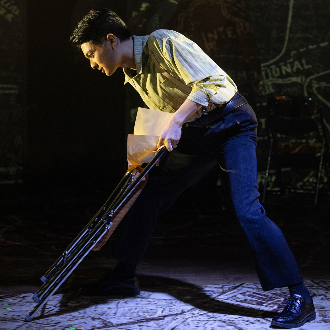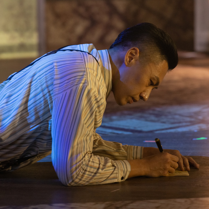 在这个家里,孙中山写下了著名的《实业计划》,此书后来与《孙文学说》《民权初步》共同构成了《建国方略》。今天看来,孙中山先生在《实业计划》中提出的关于铁路、港口、大坝的建设方案仍然具有极为超前的战略眼光。在表现《实业计划》的写作时,舞台以多媒体在地上投影大幅地图,演员们借助折叠椅的变换通过节奏紧凑、张力十足的肢体语汇,对《实业计划》所描述的内容进行了艺术化的表达,使观众直观地感受到伟人对于中国的未来所作出的富于远见的规划。