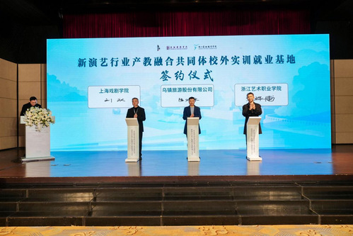 随后,乌镇旅游股份有限公司副总裁周建红、上海戏剧学院副院长刘庆、浙江艺术职业学院党委书记薛亮作为发起单位代表,分别从产业平台、院校资源等维度,阐述了协同共建的愿景与规划。