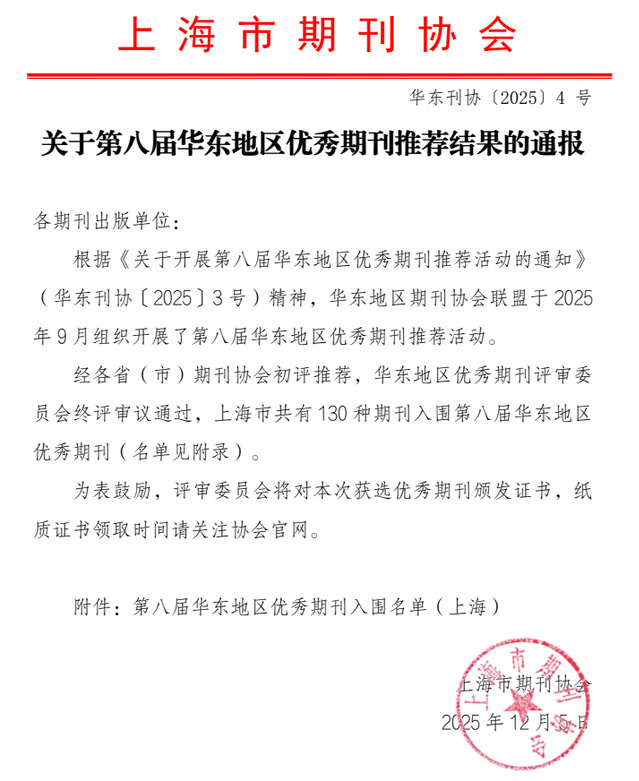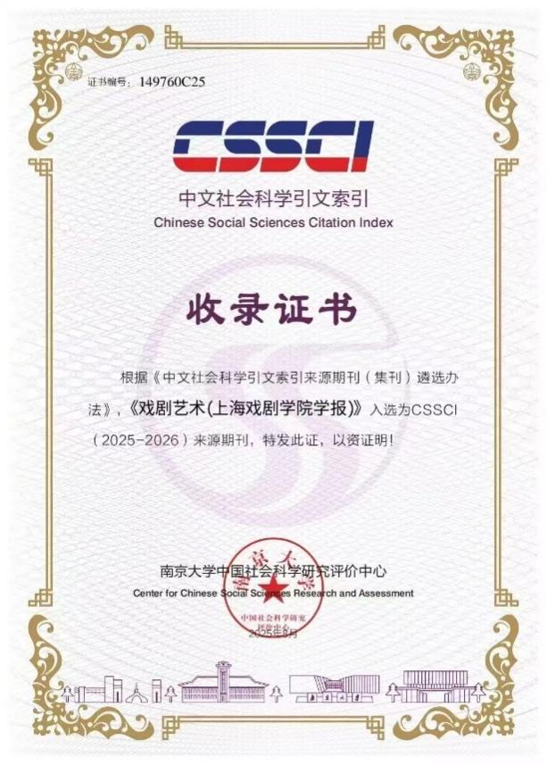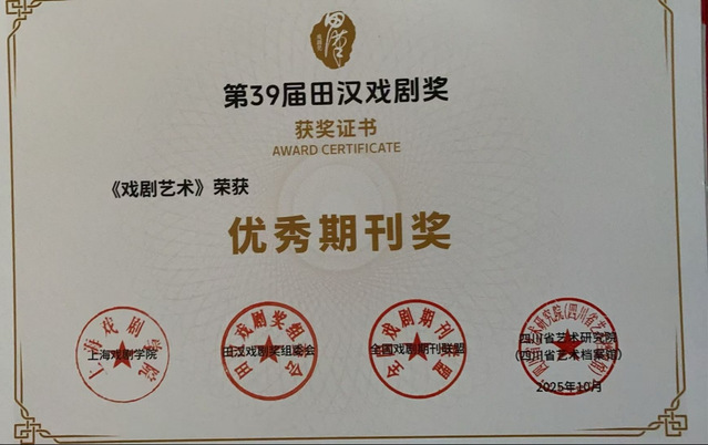 《戏剧艺术》持续推动理论创新,彰显学术引领作用,入选CSSCI(2025-2026)来源期刊,获评第三十九届田汉戏剧奖优秀期刊奖,成功入选“第八届华东地区优秀期刊”(社科人文艺术类)。