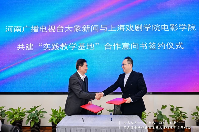 随后举行河南广播电视台大象新闻与上海戏剧学院电影学院共建“实践教学基地”合作意向书签约仪式。由河南广播电视台大象新闻行政中心副总监吴震宇和上海戏剧学院电影学院党总支书记韩永胜共同见证签约。未来双方将致力于产学研融合,坚持与时俱进,把握同心共进,协力培养新时代传播者。