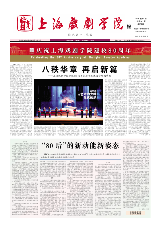 《上海戏剧学院报》2025年第8期(总第361期)已于2025年12月30日出版。重点内容有:《八秩华章 再启新篇——上海戏剧学院建校80周年高质量发展大会顺利举行》《“80后”的新动能新姿态》《八秩芳华 勇立潮头》等。敬请关注,也可点击下载阅读。(文、编辑:榕树)