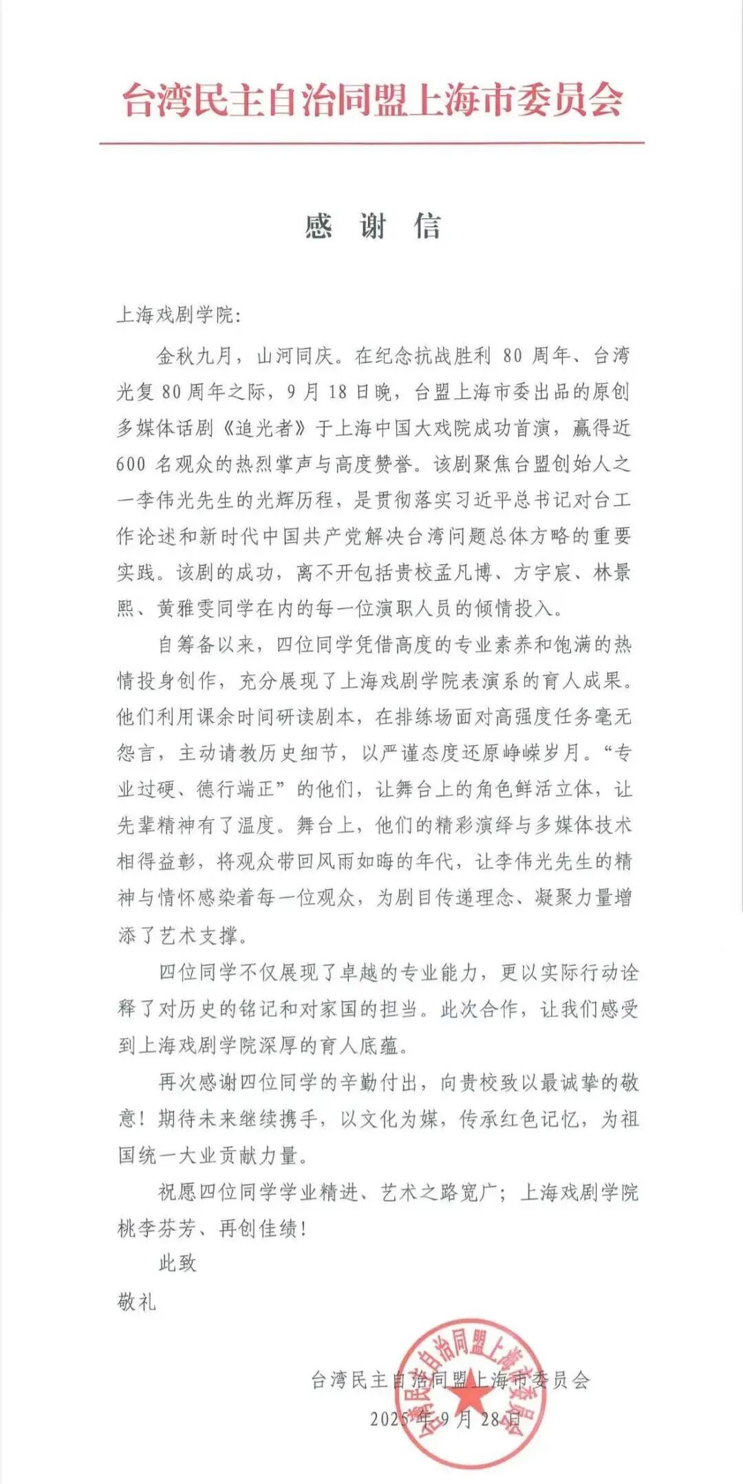 不久前,台湾民主自治同盟上海市委员会向上海戏剧学院发来感谢信,称赞上戏表演系(含音乐剧中心)四名学生,凭借高度的专业素养和饱满的热情参与台盟上海市委出品的原创多媒体话剧《追光者》的演出,以出色的表现展现了上戏的育人成果。